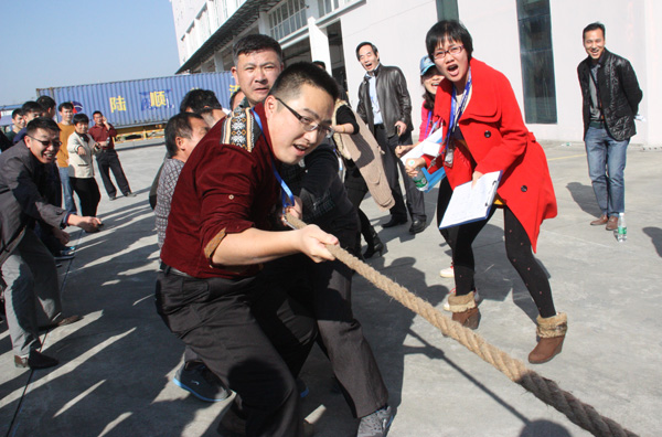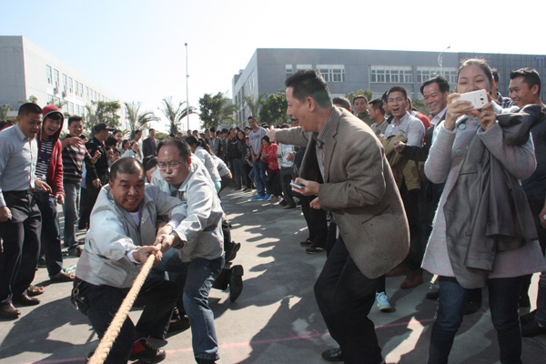 下午,一場(chǎng)別開(kāi)生面的拔河比賽將活動(dòng)推向小高潮。拔河比賽以促進(jìn)企業(yè)交流為宗旨,豐富職工體育活動(dòng)為目的,為企業(yè)搭建展現(xiàn)集體風(fēng)采的舞臺(tái),從而發(fā)揚(yáng)團(tuán)隊(duì)精神,增強(qiáng)凝聚力。此次比賽園區(qū)企業(yè)積極響應(yīng),共有11個(gè)企業(yè)組隊(duì)參加,特別是有些企業(yè)為了參賽,臨時(shí)停工,比賽結(jié)束后回單位繼續(xù)生產(chǎn),體現(xiàn)了園區(qū)大家庭的凝聚力。每支參賽隊(duì)伍共15人,其中男生10人,女生5人,實(shí)行淘汰制晉級(jí)方式。當(dāng)比賽哨聲響起,各參賽隊(duì)員們口中一起高呼“一二,一二”,雙手緊握長(zhǎng)繩,憋足勁拼命往后拉,拉拉隊(duì)在旁助陣加油,恨不得抓起繩子跟隊(duì)員們一起努力,各種加油聲、吶喊聲此起彼伏,回響至整個(gè)園區(qū)。經(jīng)過(guò)激烈較量,最終冠捷科技獲得冠軍,瑞達(dá)物業(yè)獲得亞軍。