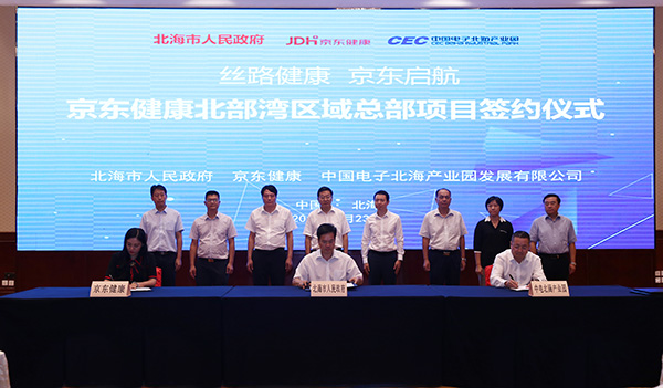 2019年9月23日,京東健康北部灣區(qū)域總部項目簽約儀式在北海香格里拉大酒店舉行。市長蔡錦軍,京東集團副總裁、京東健康首席執(zhí)行官辛利軍,中電北海產(chǎn)業(yè)園發(fā)展有限公司執(zhí)行董事徐俊男等見證簽約儀式。